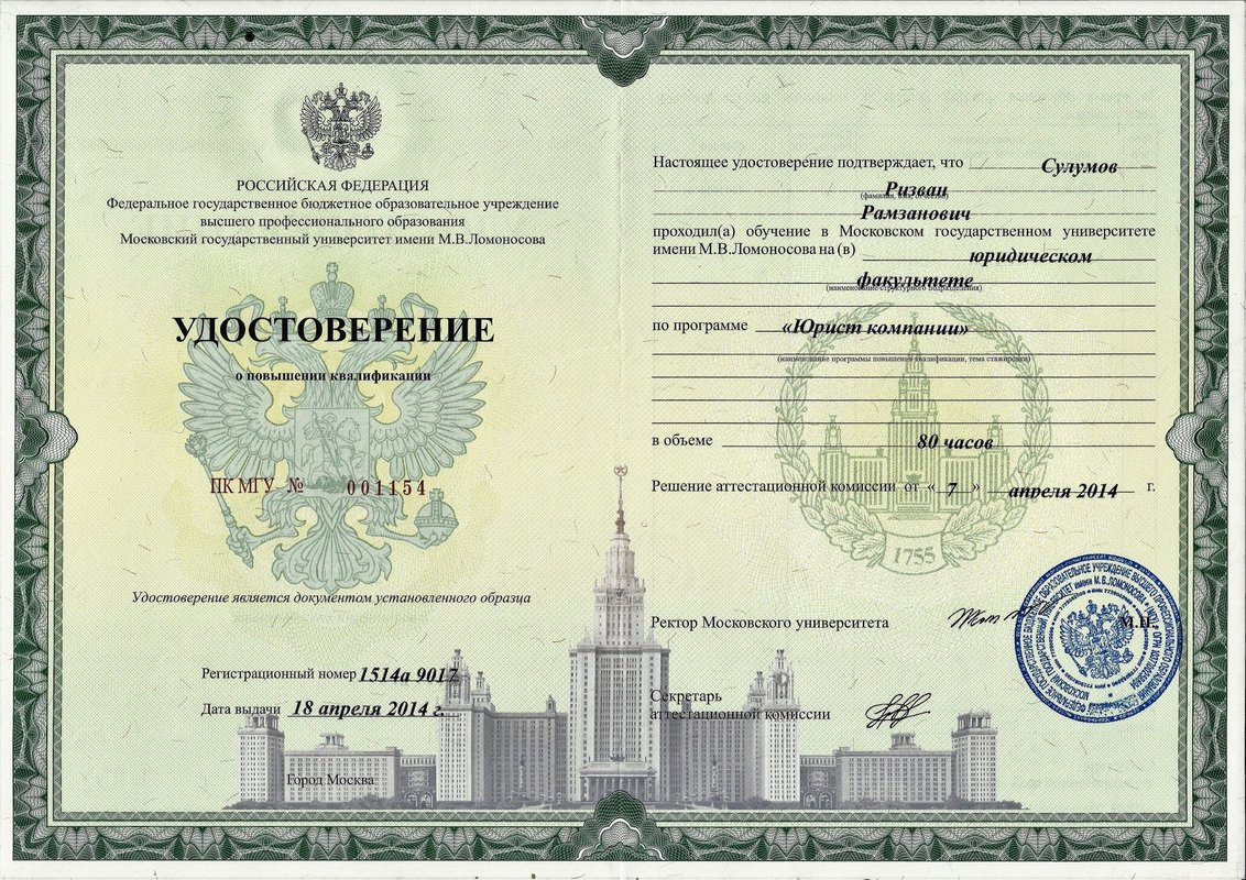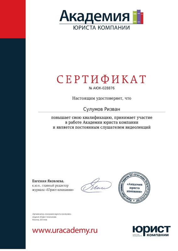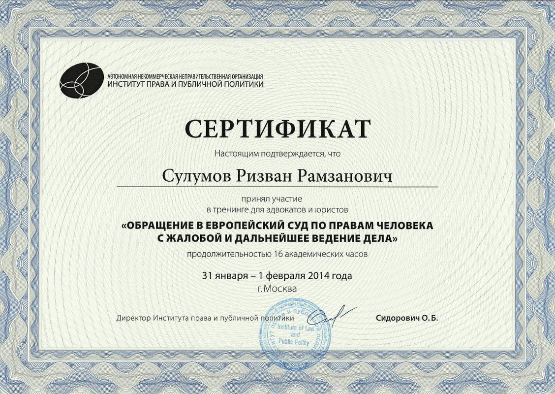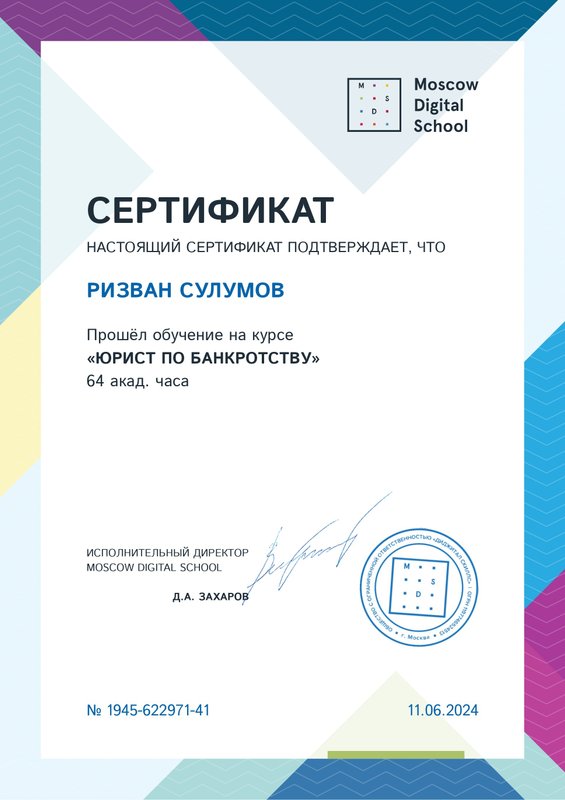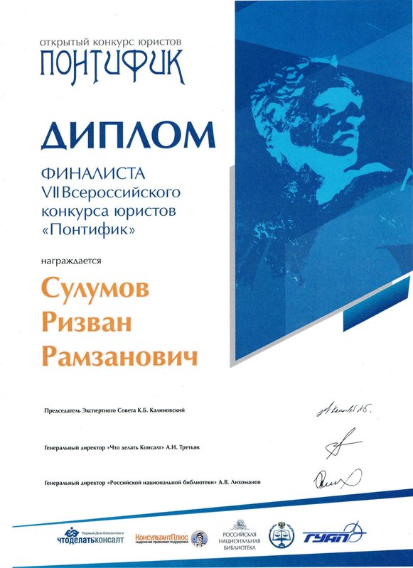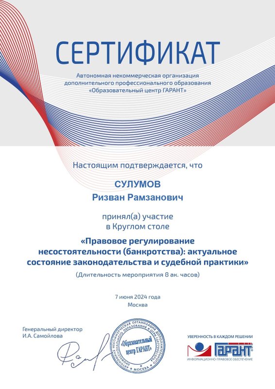 Приветствую Вас! Я, Сулумов Ризван Рамзанович, в 2008 году окончил Ставропольский институт имени В.Д. Чурсина по специальности «Юриспруденция». В 2014 г. повышал квалификацию в Московском государственном университете имени М.В. Ломоносова по программе «юрист компании». В 2014 г. принял участие в тренинге для адвокатов и юристов в Институте права и публичной политики по теме: «Обращение в Европейский суд по правам человека с жалобой и дальнейшее ведение дела». В 2014 г. стал финалистом в VII Всероссийском конкурсе юристов «Понтифик». В 2016 г. принял участие в семинаре для адвокатов и юристов в Институте права и публичной политики по теме: «Жалоба в Конституционный суд России: возможности, риски, перспективы». В 2018 г. повышал квалификацию в Московском государственном юридическом университете имени О.Е. Кутафина по программе: «ведение гражданских дел в судах: практические рекомендации». С 2014 г. являюсь член Московского регионального отделения Ассоциации юристов России. С 2019 г. член Союза юристов Москвы.
