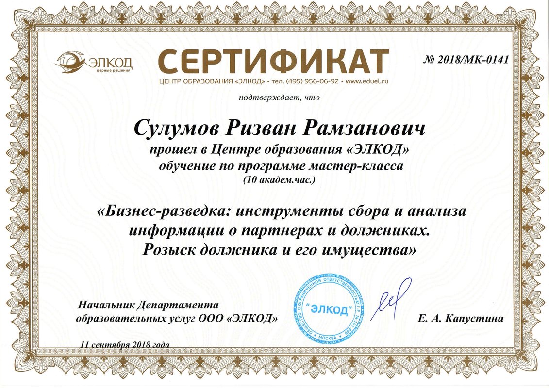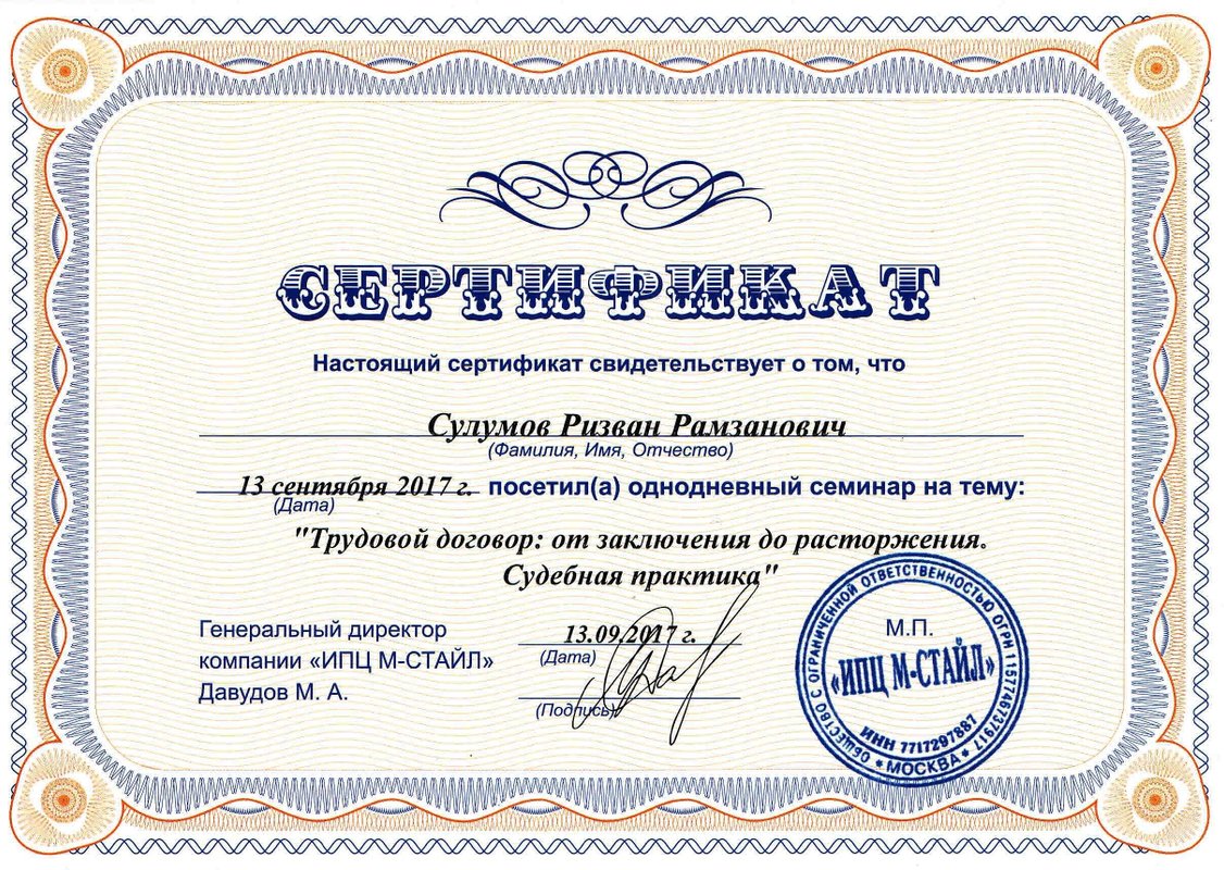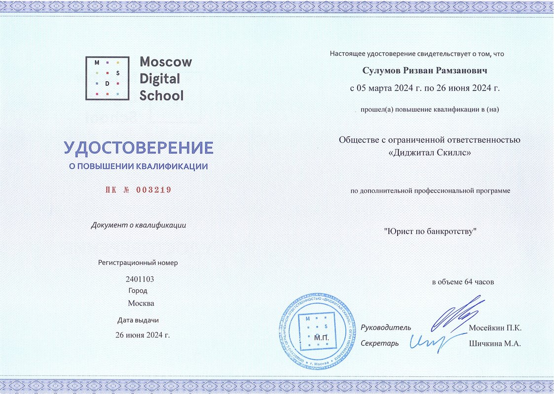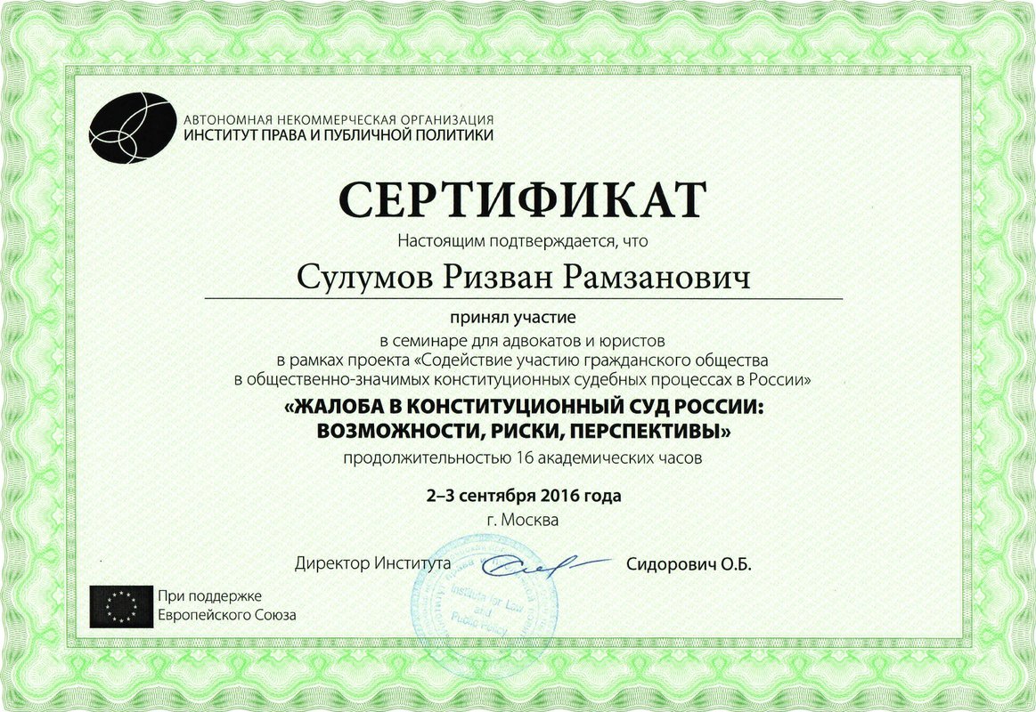 Приветствую Вас! Я, Сулумов Ризван Рамзанович, в 2008 году окончил Ставропольский институт имени В.Д. Чурсина по специальности «Юриспруденция». В 2014 г. повышал квалификацию в Московском государственном университете имени М.В. Ломоносова по программе «юрист компании». В 2014 г. принял участие в тренинге для адвокатов и юристов в Институте права и публичной политики по теме: «Обращение в Европейский суд по правам человека с жалобой и дальнейшее ведение дела». В 2014 г. стал финалистом в VII Всероссийском конкурсе юристов «Понтифик». В 2016 г. принял участие в семинаре для адвокатов и юристов в Институте права и публичной политики по теме: «Жалоба в Конституционный суд России: возможности, риски, перспективы». В 2018 г. повышал квалификацию в Московском государственном юридическом университете имени О.Е. Кутафина по программе: «ведение гражданских дел в судах: практические рекомендации». С 2014 г. являюсь член Московского регионального отделения Ассоциации юристов России. С 2019 г. член Союза юристов Москвы.